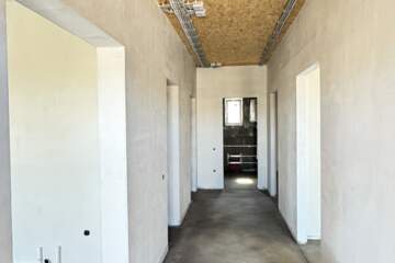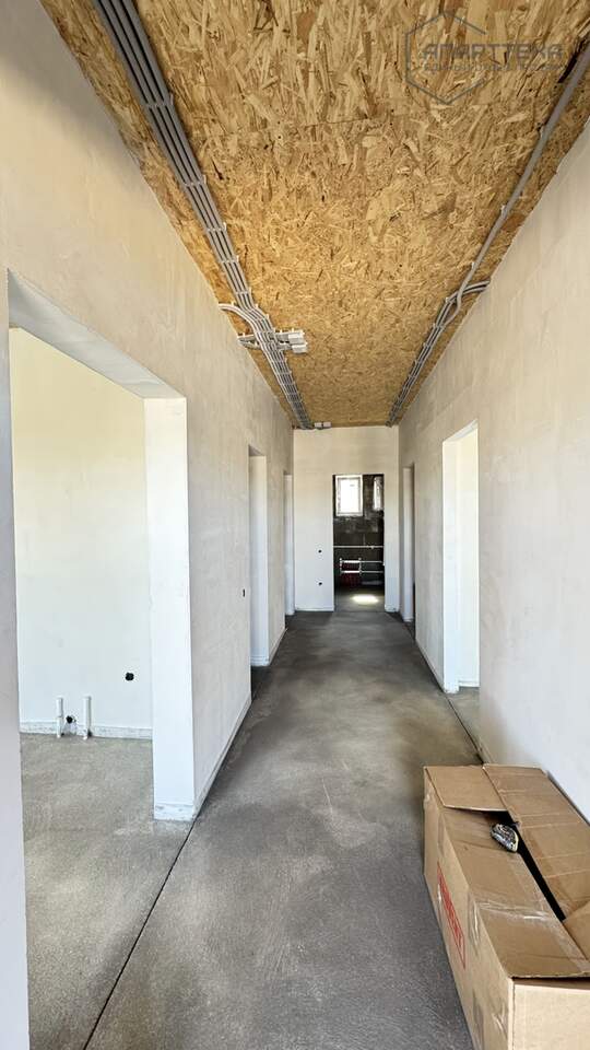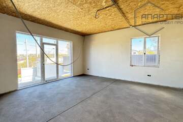 Дом: материал стен - газобетон, четырех скатная крыша - металлочерепица, три спальни (одна мастер спальня) и кухня гостинная, сан узел, выполнена чистовая стяжка, стены оштукатурены, выполнена разводка электричества.