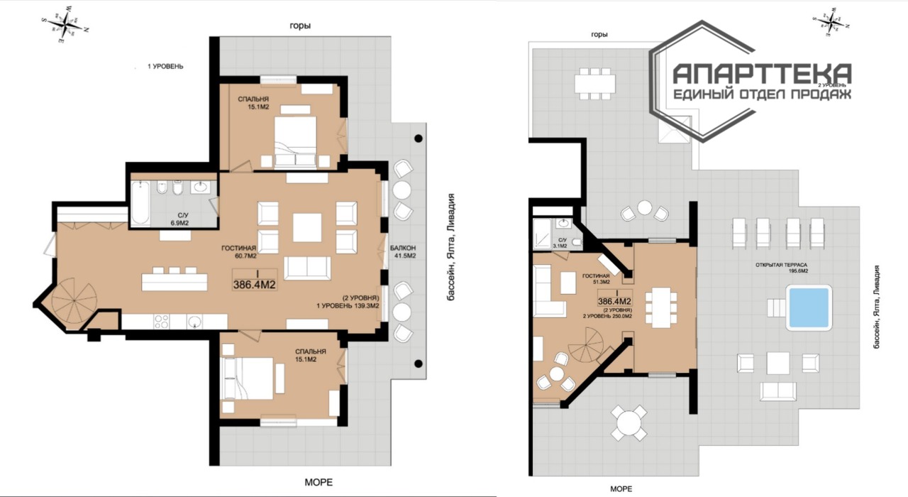 Первый уровень: 2 спальни, сан узел, кухня-гостинная 60.7 кв.м., сан узел, большой балкон 41.5 кв.м. по периметру первого уровня.