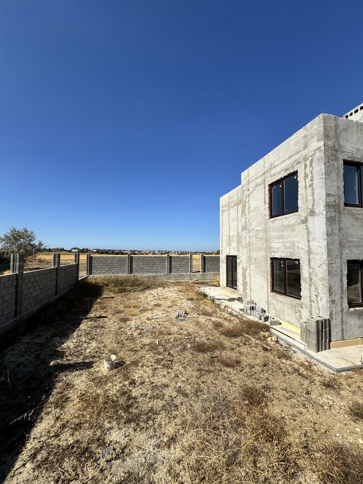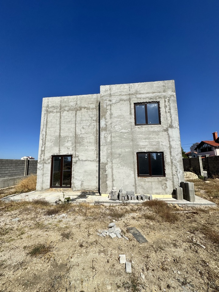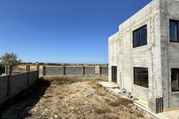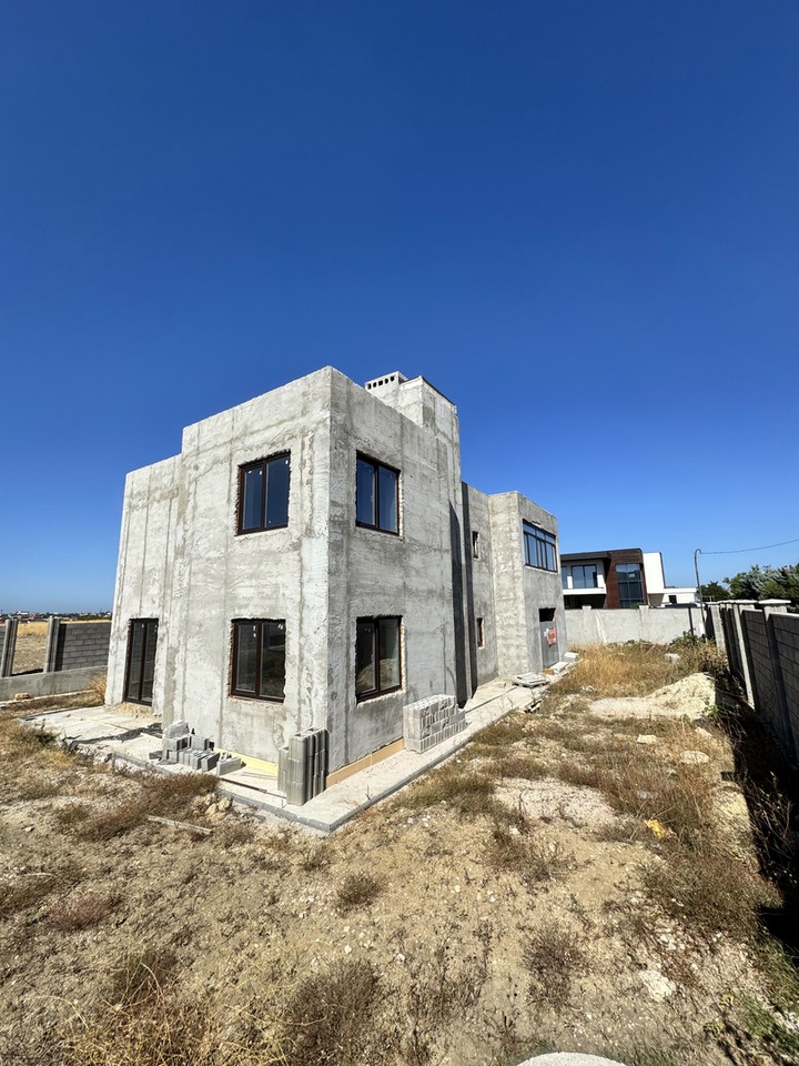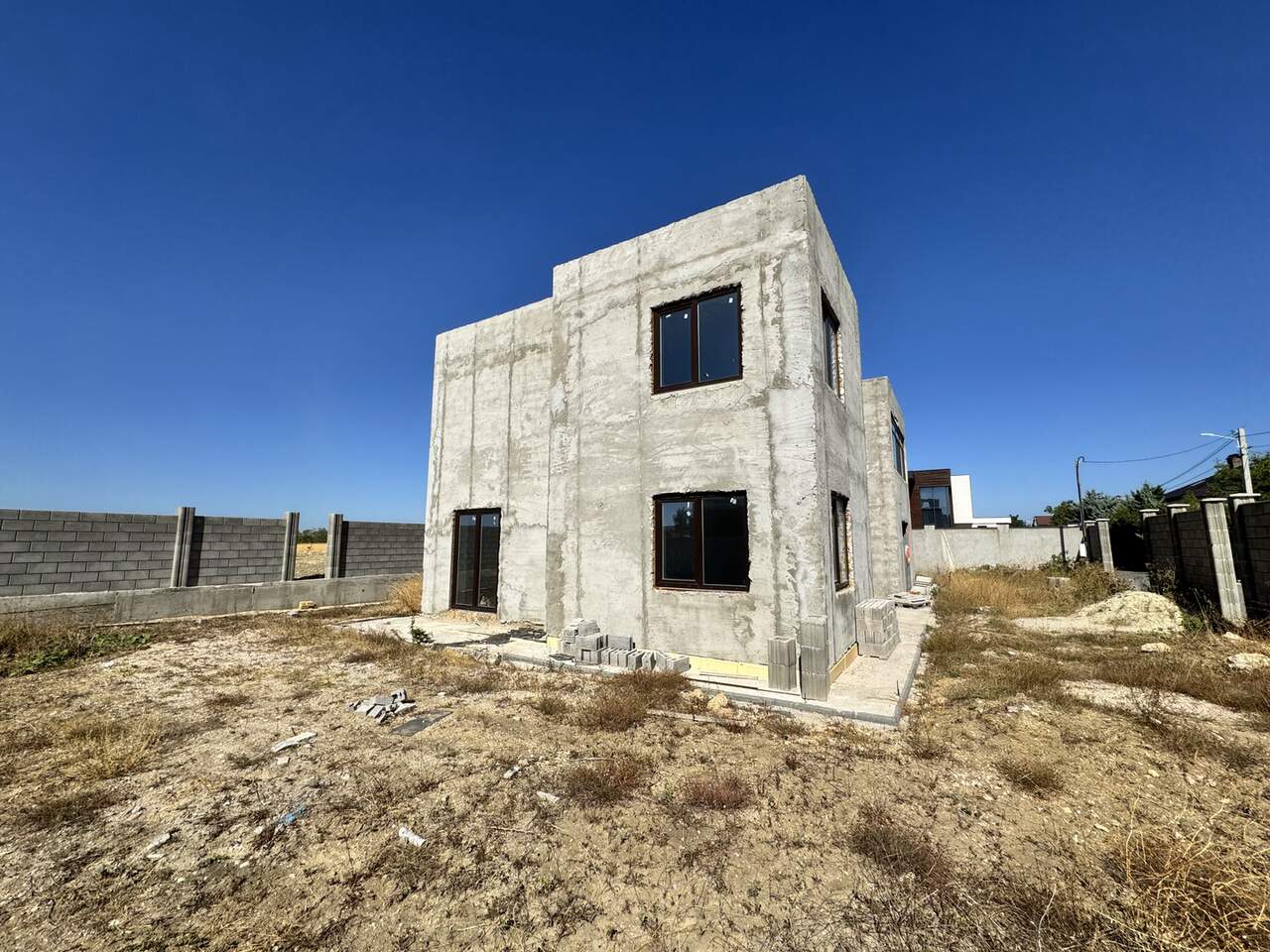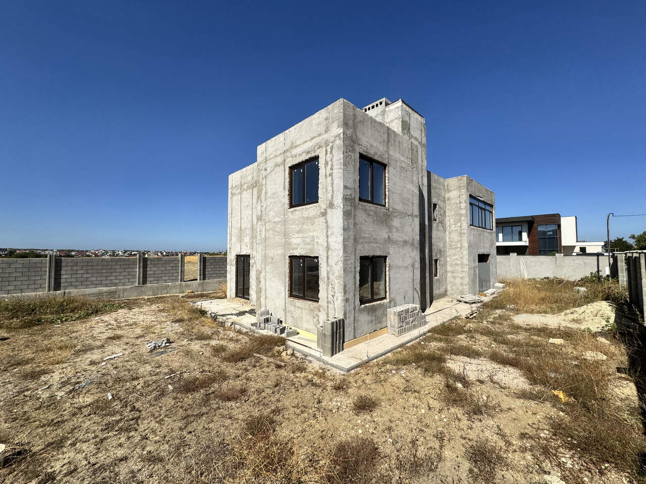 Капитальный дом 230 квадратов в стиле Хай-тэк. Фундамент монолитная плита на 24 сваях. Дом построен из ракушки в камень, монолитные перекрытия. Фасад оштукатурен и подготовлен под утепление. Внутренние перегородки из красного кирпича, выполнена внутренняя штукатурка стен и разводка электричества. Панорамное остекление лестничного пролета первого и второго этажей.